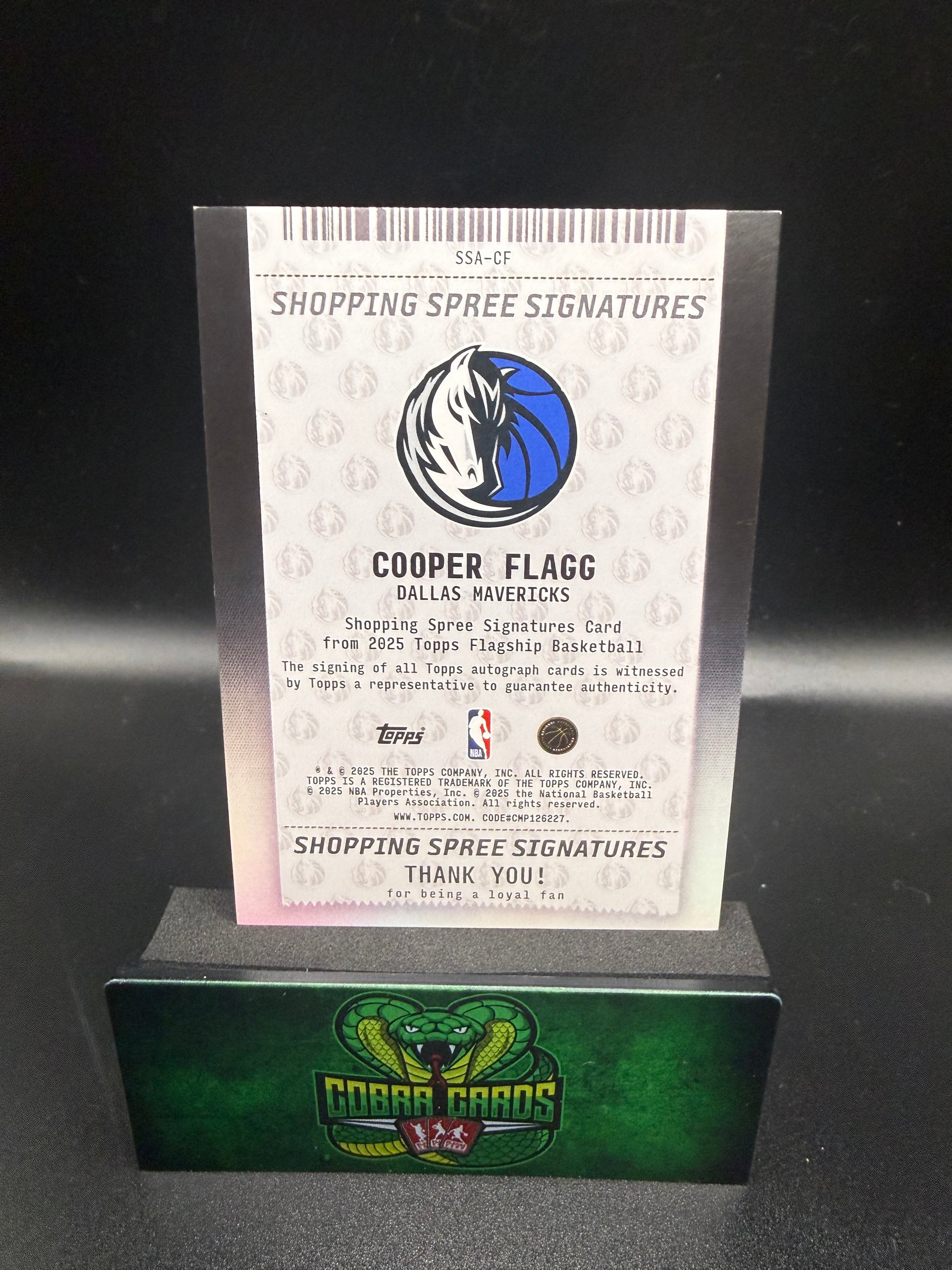 Score an incredible addition to your NBA collection with this autographed 2025 Topps Flagship Shopping Spree Signatures rookie card of Cooper Flagg, proudly representing the Dallas Mavericks! This rare card is serial numbered 15/50 and features a bold signature from one of basketball’s most exciting rising stars, making it a must-have for any serious collector or Mavericks fan.