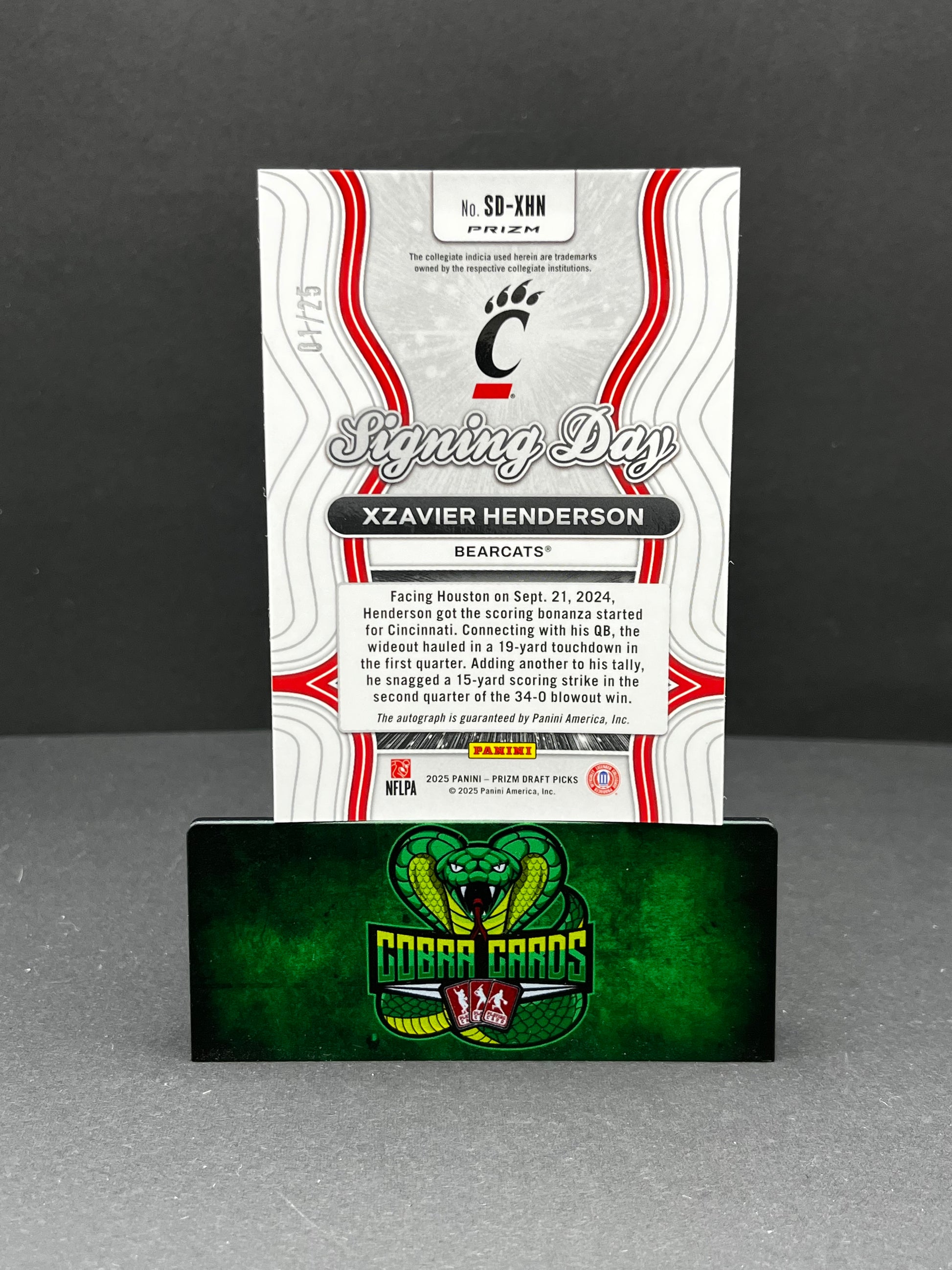 2025 Wild Card Signing Day Xzavier Henderson #SD-XHN Mojo RC 01/25 Don't miss your chance to own this rare 2025 Wild Card Signing Day Mojo Parallel rookie card of Xzavier Henderson, serial numbered 01/25 and autographed by the standout Cincinnati Bearcats wide receiver! This card is a must-have for NCAA football collectors and fans, featuring Henderson's authentic signature and the highly sought-after RC designation. With its excellent condition and exclusive Mojo variety, this limited-edition collectible stands out in any sports card collection. Secure this unique piece of football history today—perfect for both investment and display! Autographed: Yes League: NCAA Set: 2025 Wild Card Signing Day Signed By: Xzavier Henderson Card Condition: Excellent Player/Athlete: Xzavier Henderson Year Manufactured: 2025 Serial Number: 01/25 Sport: Football Parallel/Variety: Mojo Manufacturer: Wild Card Features: RC Team: Cincinnati Bearcats Card Number: SD-XHN Listed With Mascot.