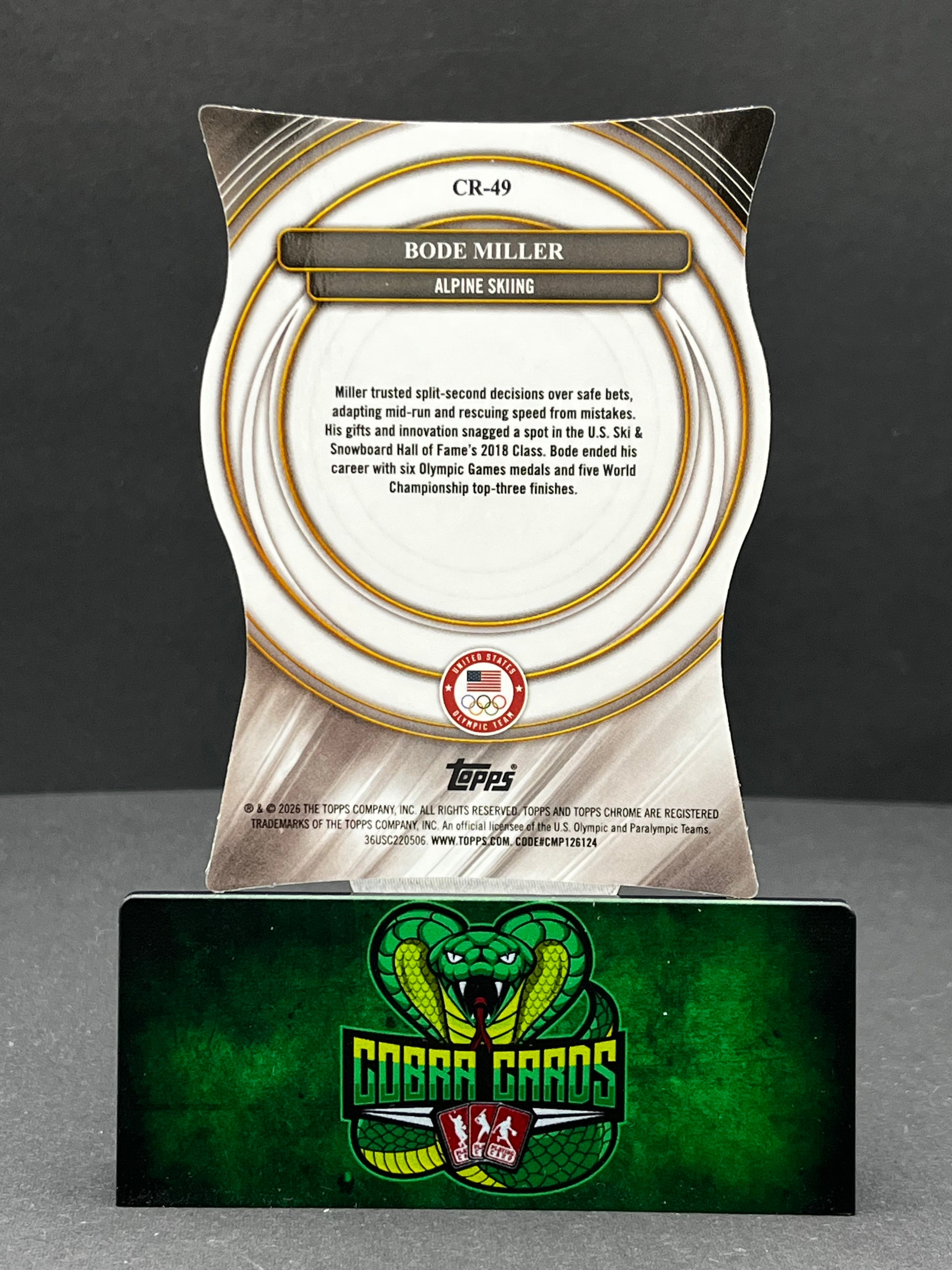 2026 Topps Chrome U.S. Olympic Team Bode Miller #CR-49 Green Chasing Rings Don't miss your chance to add this stunning 2026 Topps Chrome U.S. Olympic Team Green Refractor of Bode Miller to your collection! Featuring the eye-catching "Chasing Rings" die-cut design, this card celebrates one of the most iconic names in alpine skiing and is a must-have for Team USA and Olympic memorabilia collectors alike. Produced by Topps and in excellent condition, this card stands out with its vibrant green parallel and premium finish. Secure this rare piece of Olympic history today—perfect for fans looking to invest in a standout collectible before it's gone! Sport: Alpine Skiing Set: 2026 Topps Chrome U.S. Olympic Team Parallel/Variety: Green Refractor Card Condition: Excellent Manufacturer: Topps Team: United States Features: Die-cut, Chasing Rings Year Manufactured: 2026 Player/Athlete: Bode Miller Card Number: CR-49 Listed With Mascot.